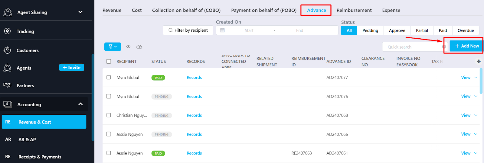 Go to: Accounting → Revenue & Cost → Advance → Add New
