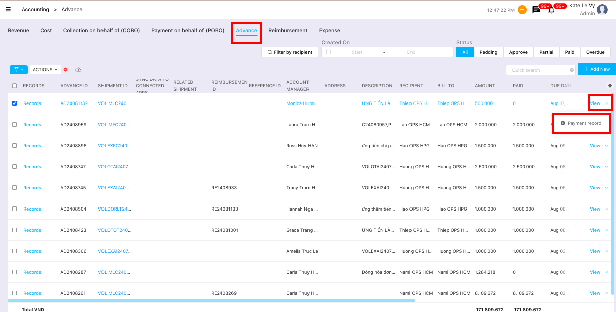 Select the Advance with status Pending → Click the arrow next to View → Click Confirm
