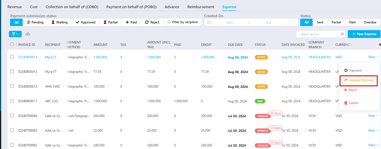 Select the Expense with status Pending → Click the arrow next to View → Click Approve or Reject