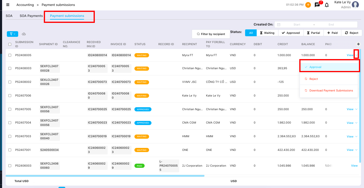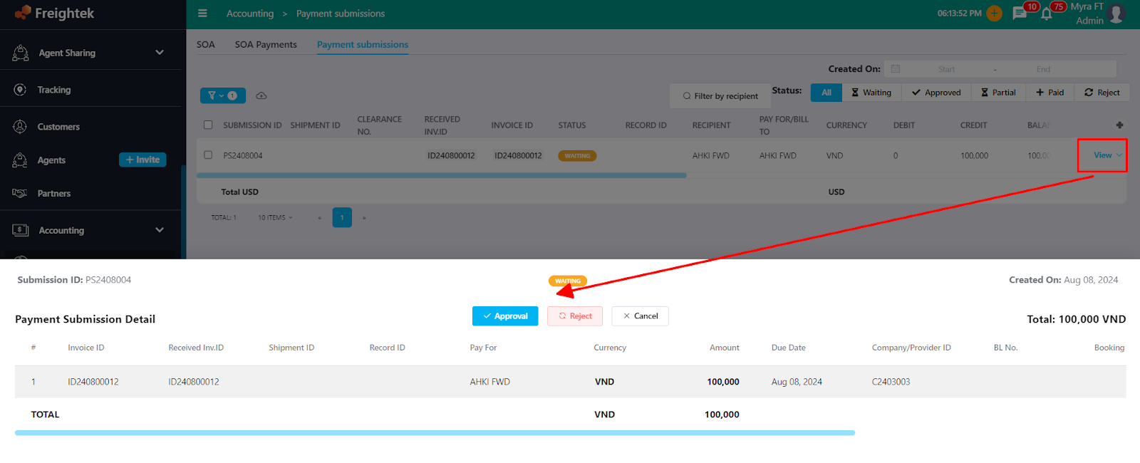 Go to: Report → SOA → Payment Submission → Open the Request with status Pending → Click Approve or Reject
