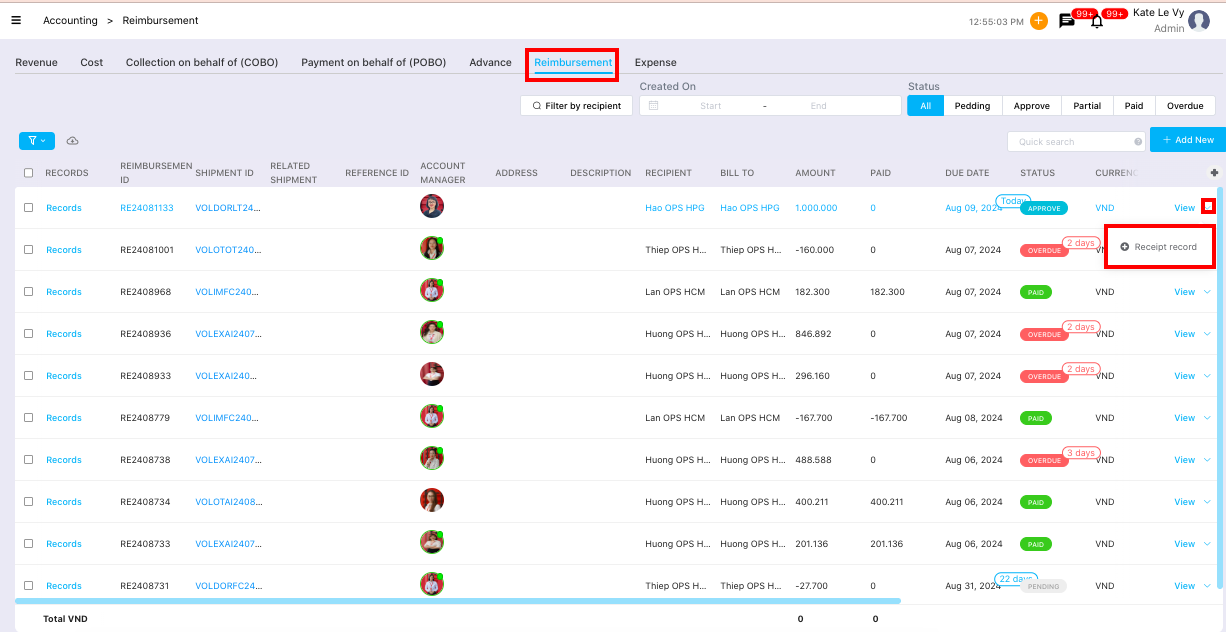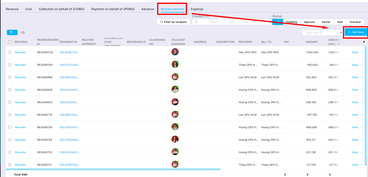 Go to: Accounting → Revenue & Cost → Reimbursement → Add New