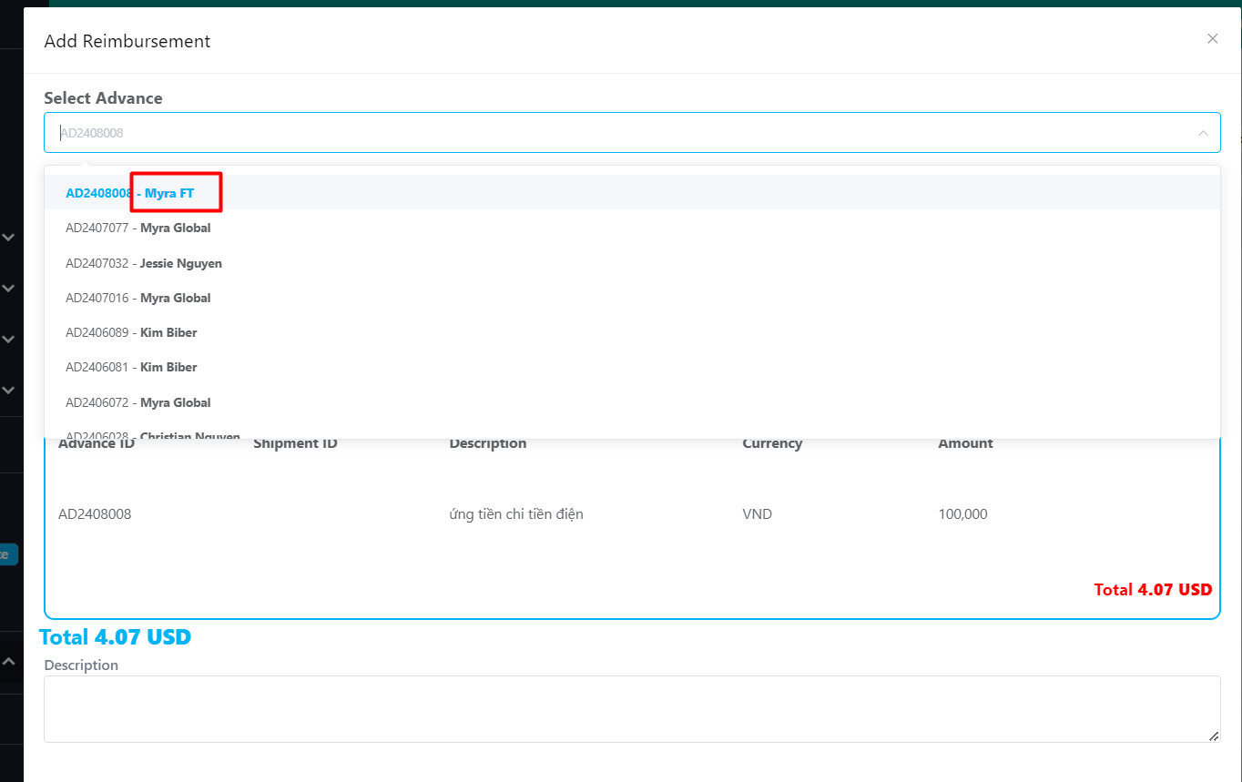 Select the Staff requesting reimbursement and select the related Advance ID.